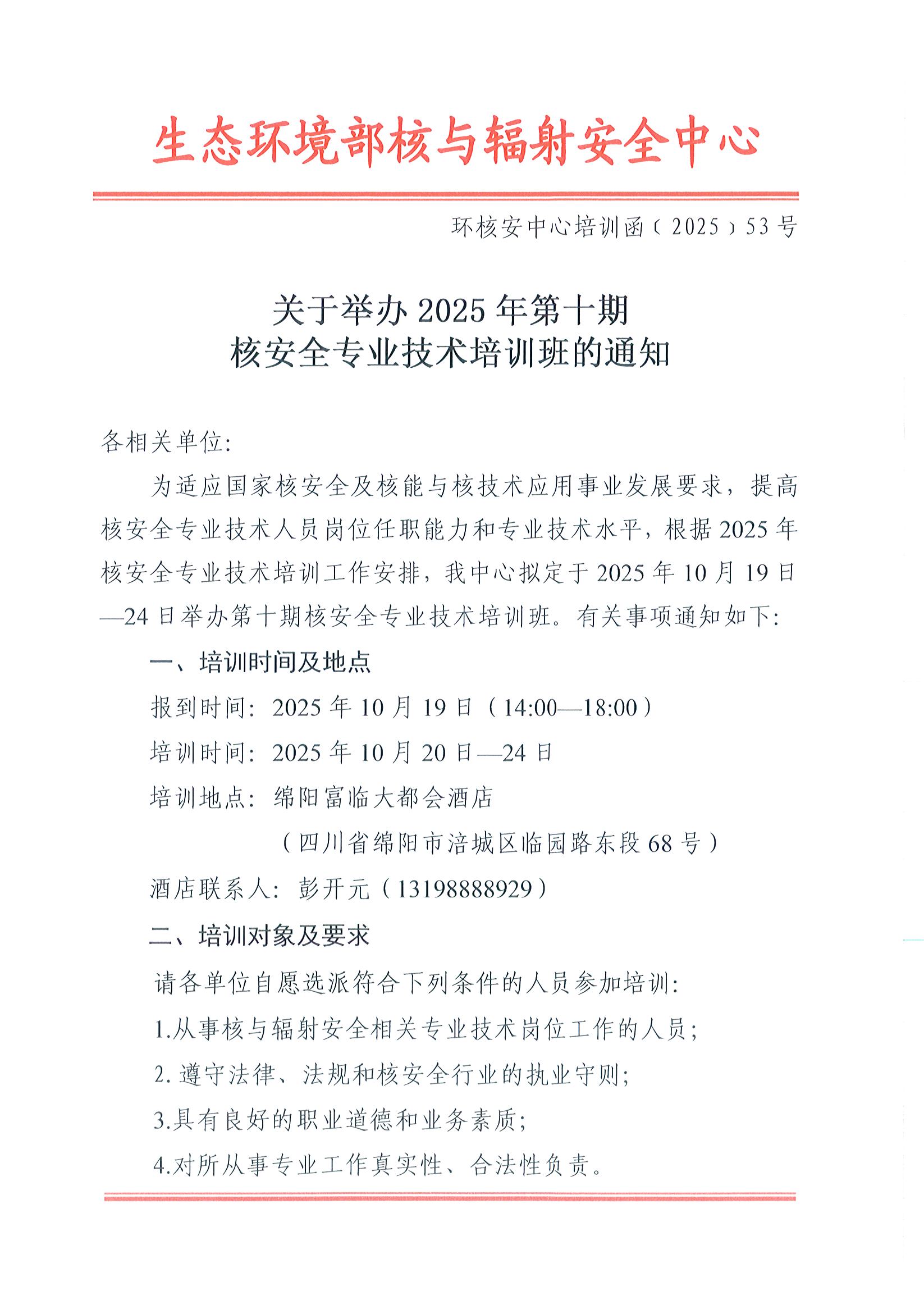 关于举办2025年第十期核安全专业技术培训班的通知