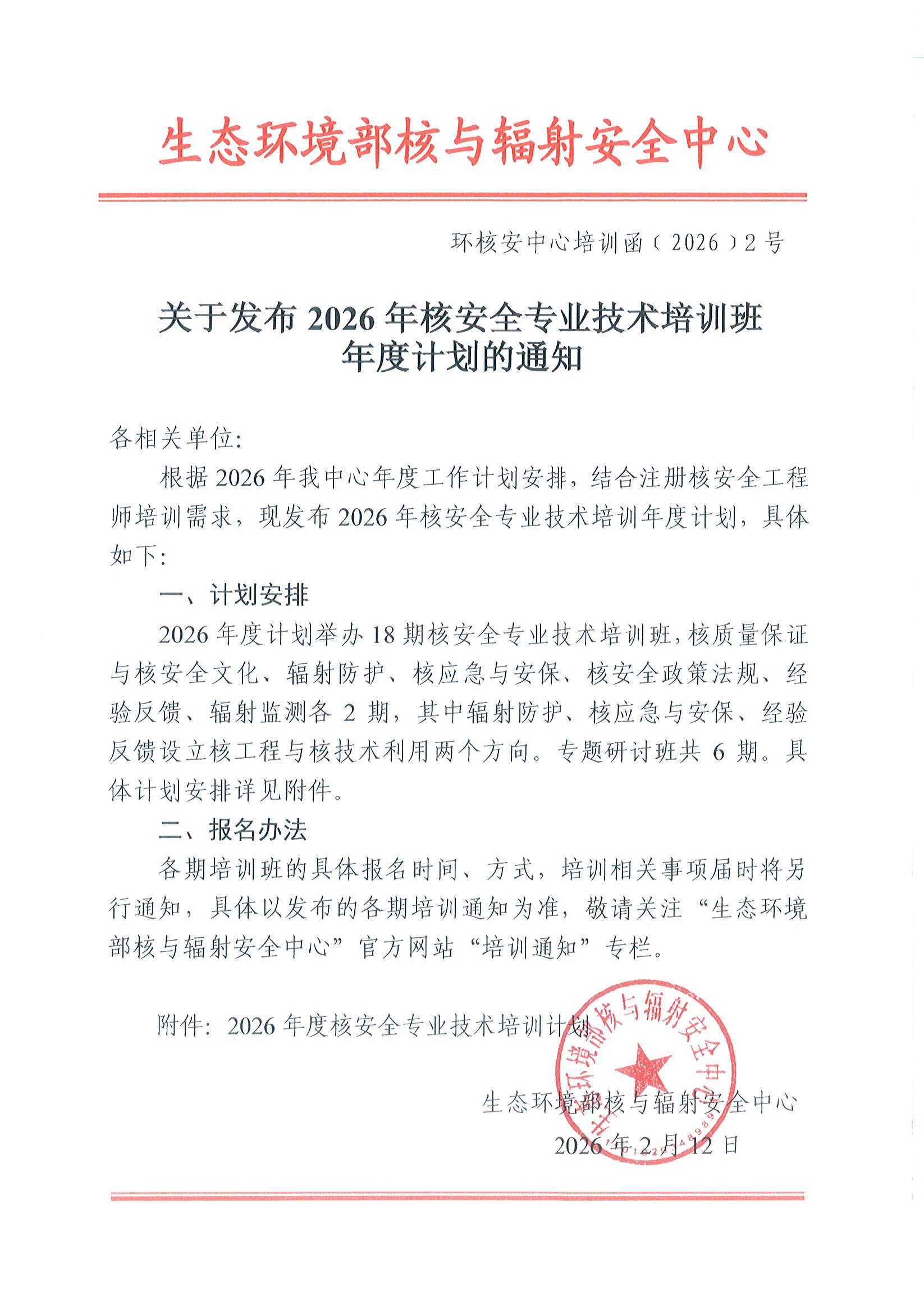 关于发布2026年核安全专业技术培训班年度计划的通知