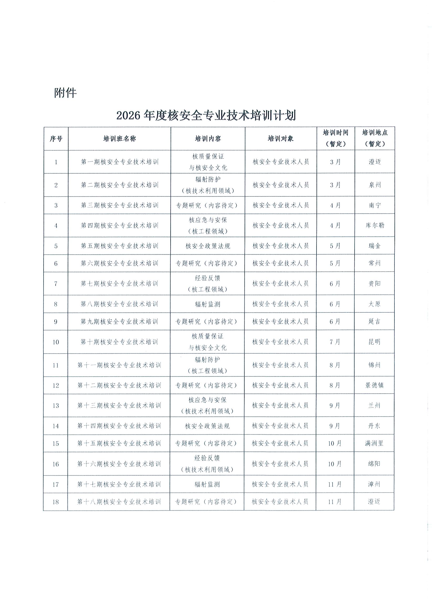 关于发布2026年核安全专业技术培训班年度计划的通知