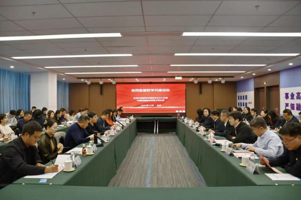 2025年12月5日,中心纪委与中国同辐股份有限公司(以下简称中国同辐)纪委在河北省涿州市原子高科华北医药有限公司(以下简称华北高科)开展“党建引领聚合力,委委协同筑核安”主题联学共建活动。此次活动严格落实二十届中央纪委四次全会关于强化全面从严治党政治责任的工作部署,以“理论联学、业务联动、监督联建”为纽带,汇聚核安全监管与企业发展的智慧力量,共同书写核安全领域的“红色答卷”。中心党委委员、纪委书记卢家栋,中国同辐党委委员、纪委书记常立明出席,中心党纪群人事党支部、科计财务党支部、辐射源党支部及中国同辐、中国同辐北京分公司、原子高科各党支部60余名党员干部代表参加活动。